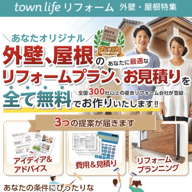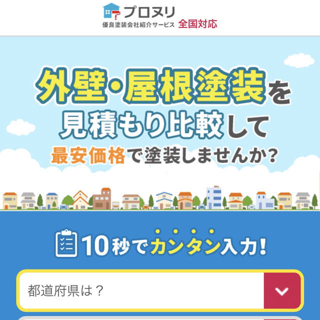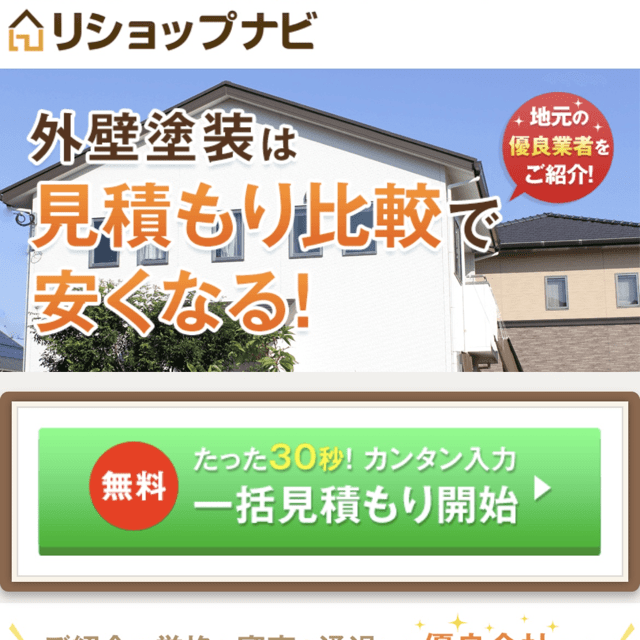| 特徴 | 提携企業1,500社。最安値リフォームという自信 | 厳選した少ない会社を紹介、リフォーム後にQUOカードプレゼント | 大手企業が運営している老舗の見積もりサービス | 圧倒的な利用者数!4秒に1人が使う外壁塗装の見積もりサービス | 最短10秒、匿名で外壁塗装の見積もりが出来るサービス | 利用者数が増えている外壁塗装見積もりサービス | 最短10秒、匿名で簡単な外壁塗装見積もりサービス | 少ない提携企業から厳選して、外壁塗装業者を紹介 |